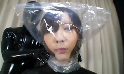 Tight black rubber mask makes Kristine Andrews suffocate and cry